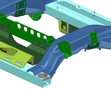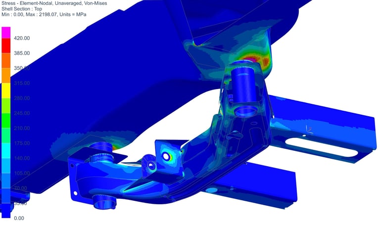 Performed analysis of highly complex front & rear vehicle subframes (stamped steel weldments & fabrications). Analysis involved both 3D and 2D meshing, plus bolted joints and contacting interfaces.